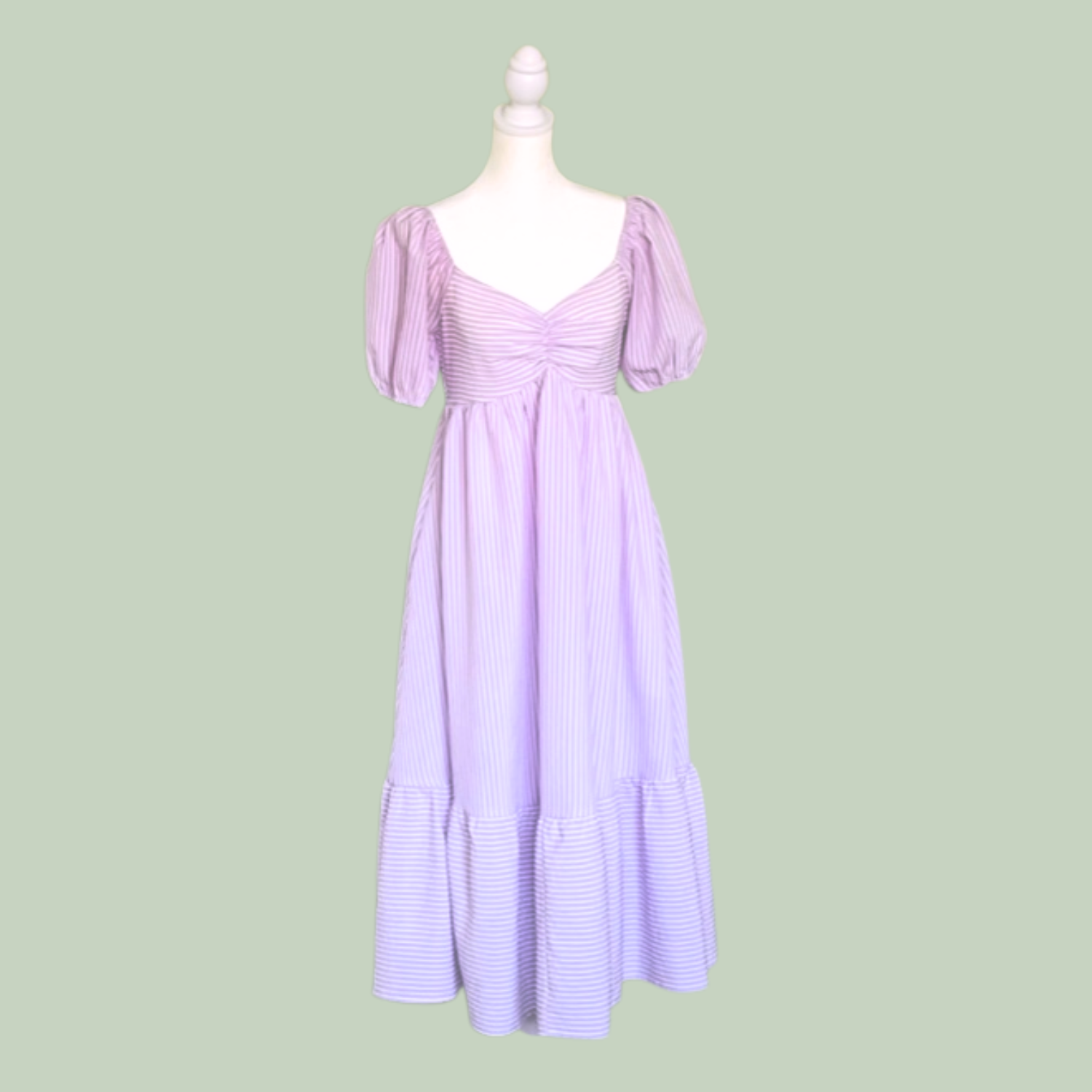 Sweetheart all day! The Sweetheart Lavender Dress is a dreamy midi with puff sleeves, a ruched sweetheart neckline, and side pockets for everyday ease. Its soft lavender stripes add a timeless charm that flows effortlessly from casual strolls to sweet summer gatherings.
